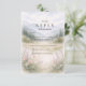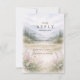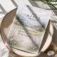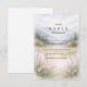 A serene and atmospheric design inspired by misty mountain landscapes and quiet forest scenery. Soft watercolor layers of pine trees and distant hills fade gently into the background, creating depth and a calm, romantic mood. The muted palette of sage green, cool grey, and soft ivory gives the design a refined, nature-driven elegance—perfect for couples drawn to minimalist aesthetics and intimate outdoor celebrations.