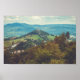 Poster featuring a vintage style photo. Romantic summer landscape: old church on the hill, small village in the mountain valley, forest in the foreground, mountains in the background. Great gift for travel lovers and outdoor enthusiasts. Stylish addition to travel-themed interior.