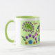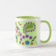 This mug has a vector illustration design with cute love birds, retro flowers and Paisley shapes / leaves in bright colours. The text on the left and on the right side are template objects and can be changed easily into any other text.