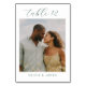 This wedding table card features a serene and intimate photograph of two individuals standing close together, framed by ample white space for a clean, minimalistic look. The colour palette includes muted tones with a light blue-grey shirt and a yellow floral dress set against a soft-focus outdoor background. Elegant cursive script fonts add a romantic touch, making it perfect for personalising your event seating arrangements. The design captures genuine emotions in a realistic style, evoking warmth and love, ideal for weddings or formal gatherings.