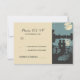 romantic wedding RSVP cards with bride and groom, trees, forest, lake, moon and string lights.