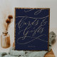 This romantic navy calligraphy cards and gifts sign is perfect for a simple wedding or bridal shower. The modern classic design features fancy swirls and whimsical flourishes with gorgeous elegant hand lettered faux champagne gold foil typography. The line of text at the bottom of the sign can be personalised with the date, the names of the bride and groom, or a short message like "Thank you". This sign can be used for a wedding or any event or party.