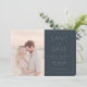 This wedding save the date features a split layout with a romantic beach photograph on one side and elegant navy background on the other. The design combines soft, natural lighting from the photo with clean serif and sans-serif typography for a modern yet timeless look. Its minimalistic color palette of warm beige, light blue, and deep navy creates a serene and intimate mood, perfect for announcing your special day. The clear hierarchy and ample negative space ensure readability while maintaining an inviting and sophisticated aesthetic.