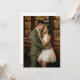 This wedding invitation features a romantic and intimate design with two individuals in an affectionate pose, set against the backdrop of a stylish bar. The warm colour palette includes earthy browns from the wooden shelves and soft olive green from one individual's suit, contrasted by the brightness of a white dress. The photographic art technique captures a realistic and tender moment, emphasizing natural expressions and textures. The overall mood is joyful and loving, perfect for celebrating a special occasion.
