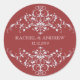 Romantic antique ornaments in white against a deep red background serve as a framework for this sticker. Fully customise it with your own name(s) and event date. Stick it on envelopes or correspondence, seal favour bags, label boxes, etc. A sticker suitable for any occasion: weddings, engagement parties, a save-the-date or a corporate event. Available in alternate colours with matching cards, favours and postage.