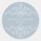 Romantic antique ornaments in white against a light silvery blue background serve as a framework for this sticker. Fully customise it with your own name(s) and event date. Stick it on envelopes or correspondence, seal favour bags, label boxes, etc. A sticker suitable for any occasion: weddings, engagement parties, a save-the-date or a corporate event. Available in alternate colours with matching cards, favours and postage.
