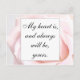 "My heart is, and always will be, yours." ~ Edward Ferrars to Elinor. This postcard features a romantic quote by Jane Austen from her novel Sense and Sensibility in an elegant black font script, and a pretty pale pink floral rose background. Perfect for sending to the one you love!