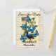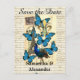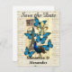 Pretty romantic Paris themed save the date announcement, with an old antique illustration background and Eiffel tower and blue butterflies and peacock with a gold fleur de lys, add your personal text to create your own special custom french themed wedding save the date announcement.