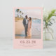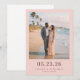 This wedding save the date features a romantic beach scene with two individuals standing close together on the shoreline, set against a backdrop of palm trees and gentle ocean waves. The design uses warm pastel tones like light pink, beige, and soft blue to create a serene and inviting atmosphere. The contemporary layout includes ample negative space, with elegant serif typography centred at the bottom for a classic touch. Perfect for announcing your special day, this design captures an intimate and celebratory mood, ideal for a beach-themed wedding.