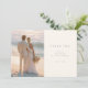 This wedding thank you card features a beautifully balanced layout with a romantic beach photograph on the left and elegant, minimalist text on the right. The color palette includes soft pastels and warm tones like pale pinks, creamy whites, and golden yellows, creating a serene and inviting atmosphere. The design combines a candid moment of a couple at sunset with refined typography in a simple serif font, conveying both elegance and heartfelt gratitude. Perfect for expressing thanks after a memorable celebration, this card captures the essence of love and togetherness.