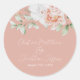 This romantic floral wedding sticker features an elegant dusty peach background with watercolor peach and white flowers. A delicate bouquet is pictured on the top. Sample names of a couple are printed below in an elegant script font.