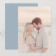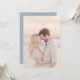 This wedding invitation features a romantic beach scene at sunset, capturing an intimate moment between two individuals. The design showcases warm peach and pink tones in the clothing, contrasted with cool blues of the ocean and sky, creating a serene and harmonious atmosphere. The photographic realism highlights genuine expressions and emotions, while the soft focus on the background emphasizes the tender connection between the figures. Perfect for couples seeking a dreamy, tranquil aesthetic to celebrate their special day.