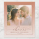 This wedding wine label features a romantic and elegant design with a soft peach gradient background, framed by thin black borders. The central photograph captures an intimate moment between two individuals, evoking warmth and affection in a sunny outdoor setting. Below the image, "cheers" is written in a sophisticated cursive script, while customisable names and dates are presented in a simple serif font, adding personalisation to this celebratory piece. Perfect for commemorating special occasions like weddings, this label combines photographic realism with stylish typography to create a joyful and heartfelt atmosphere.