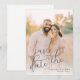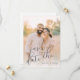 This wedding save the date card features a warm, romantic design with two individuals standing close together in an outdoor setting, surrounded by softly blurred greenery and golden light. The colour palette includes soft pastels like peach, beige, and cream, creating a serene sunset ambiance that enhances the intimate feel of the scene. Elegant script typography highlights "save the date," while simpler fonts provide additional details, ensuring readability against the lighter background. The overall mood is joyful and inviting, perfect for celebrating this significant life moment.