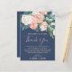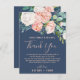 This romantic peonies blue thank you reception card is perfect for an elegant wedding. The floral design features blush pink, peach and white cascading watercolor flowers on a navy blue background. Place these cards at the table setting for each of your guests at your wedding reception. Personalise the card with your names and a special thank you message.