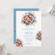 A beautifully illustrated bouquet of flowers. The bouquet consists of large, vibrant peonies in shades of terracotta and blue, complemented by smaller blue tulips. There are also green leaves and golden accents, possibly representing stems or other floral elements. The flowers are centrally positioned, with a pair of intertwined golden rings placed amidst them. The entire composition is set against a white background, emphasizing the colours and details of the flowers.