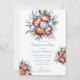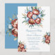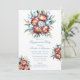 A beautifully illustrated bouquet of flowers. The bouquet consists of large, vibrant peonies in shades of terracotta and blue, complemented by smaller blue tulips. There are also green leaves and golden accents, possibly representing stems or other floral elements. The flowers are centrally positioned, with a pair of intertwined golden rings placed amidst them. The entire composition is set against a white background, emphasizing the colours and details of the flowers. With two wedding rings in the centre of the flowers.