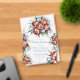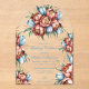 A beautifully illustrated bouquet of flowers. The bouquet consists of large, vibrant peonies in shades of terracotta and blue, complemented by smaller blue tulips. There are also green leaves and golden accents, possibly representing stems or other floral elements. The flowers are centrally positioned, with a pair of intertwined golden rings placed amidst them. The entire composition is set against a white background, emphasizing the colours and details of the flowers.