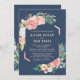 This romantic peony flowers blue wedding invitation card is perfect for an elegant wedding. The floral design features blush pink, peach and white watercolor flowers with faux rose gold geometric elements on a navy blue background.