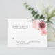 Romantic and beautiful, this wedding RSVP card design features a watercolor floral bouquet in pink, burgundy and trailing greenery along one upper corner. The look is both simple and elegant. This wedding response card is a wonderful choice for spring or summer weddings, garden weddings, church weddings, weddings held in public venues and more. Personalise the text template with your required response date.