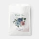 Beautiful botanical wedding favour bag featuring pink, dusty blue and navy blue flowers with green leaves.