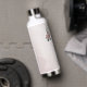 Unique water bottle featuring romantic pink flowers and some beautiful green leaves.