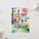 This invitation features a romantic landscape with a lighthouse in the background, viewed from inland and surrounded by trees, foliage, and soft pink vegetation tones. The illustration conveys a warm and feminine atmosphere, with a serene and charming feeling that evokes peaceful walks, nature, and shared moments. The presence of the bicycle adds a sweet and approachable touch, reinforcing the sense of a special weekend enjoyed calmly and joyfully among friends.