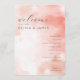 This wedding program features a soft, watercolor background in hues of pink and peach, creating an ethereal and romantic atmosphere. The layout is vertically oriented with centrally aligned text, using elegant cursive for the welcoming message and bold serif fonts for the names, ensuring a sophisticated look. A clean sans-serif typeface lists the ceremony schedule, maintaining clarity and readability. The minimalist design focuses on elegance through simplicity, making it perfect for couples seeking a warm and inviting aesthetic for their special day.