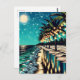 Pretty romantic coastal keeping in touch missing you postcard. Ai art depicting a row of palm trees with illuminated white lights on them. A pretty reflection on the sandy beach and waves.