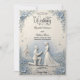 Set the tone for your formal engagement with a romantic, dusty blue and creamy off-white design featuring an elegant printed sculptural proposal scene.This formal stationery design employs a simulated bas-relief sculptural aesthetic, utilizing digital 3D shadow techniques to create the visual illusion of carved paper craft. The central composition features an elegant proposal scene with a kneeling groom and a bride in a flowing gown, set against a traditional chapel backdrop and framed by an intricate botanical border of leaves and floating petals. The atmospheric color palette pairs cool dusty blue and light grey tones against a warm, creamy off-white background, establishing visual hierarchy through sophisticated calligraphy script and traditional serif typography.This is a flat printed image with a faux embossed texture effect, not actual raised material.