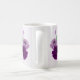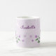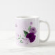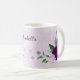 Beautiful romantic coffee mug featuring purple flowers and some green leaves .