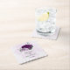 Beautiful romantic paper coaster featuring purple flowers and some green leaves .