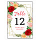 This beautiful and elegant wedding table number sign features watercolor red, pink and orange roses with foliage on a gold geometric frame. The text combines handwritten script and serif fonts for a stylish and modern look. This is perfect for a summer rustic wedding.