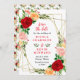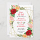 This fun and whimsical save the date invitation features watercolor red, pink and orange roses with foliage on a gold geometric frame. The text combines handwritten script and serif fonts for a stylish and modern look. This is perfect for a spring or summer rustic wedding.