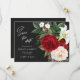 Beautiful watercolor floral bouquet in rich reds and whites, includes gorgeous peonies, lilies, lush greenery and baby's breath. The bouquet is set over a black watercolor background, with your wedding details done in simple elegant white calligraphy script. On the back you'll find coordinating florals and the bride and groom's monogram.