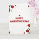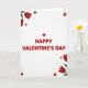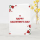 This card features the large headline “HAPPY VALENTINE’S DAY” centered in strong red lettering on a soft white background that fades gently at the edges, with a tiny red heart standing in for the apostrophe ❤️. Red tulips with deep green leaves lean in from the top-left corner and rise again from the bottom-right, as if two bouquets are reaching toward each other. Around the message, small solid red hearts are sprinkled like confetti, some floating near the flowers and others drifting closer to the words, adding a flirty, friendly warmth 🥰. A few tiny black dots sit between the hearts and tulips, giving the layout a modern, lightly textured look without stealing focus. The red of the text matches the tulip petals, tying everything together so the center message feels hugged by the corner florals. The lettering stays clean and easy to read, with the brightest red concentrated in the main line and the heart-apostrophe acting as a sweet visual wink. In the corners, the tulip petals are a rich crimson while the leaves are layered in green, with scattered red hearts and small black dots filling the open space.