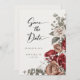Classic traditional and elegant spray of warm red, antique white and tan roses, baby's breath and eucalyptus on a cream watercolor style background with custom calligraphy Save the Date script (colour can be customised) and editable text fields. Back features complementary graphics and additional text fields.