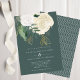 A modern and romantic wedding invitation, perfect for an autumn or winter wedding. This design features a cascade of watercolor roses in white and ivory, green leaves and a dusting of faux glitter, on a dark sage green background. The reverse is also in solid dark green.