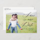 This romantic save the date postcard features a full photo and elegant script. On the front of the card, black modern calligraphy reads "Save our Date" and overlays a full-bleed, landscape-orientation photo. The couple's names, wedding date, and wedding location are written in black on the front of the postcard. The back of the save the date includes room to add additional wedding details (such as the wedding website).