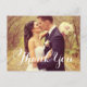 Soft and dreamy, this full-bleed photo thank you postcard features "Thank You" in a romantic, flowing white script with graceful curves — a distinctly lighter and more intimate style than traditional calligraphy. The white lettering sweeps beautifully across your wedding photo, with the customizable couple names and message on the reverse. A lovely choice for couples who want an understated yet heartfelt photo card.