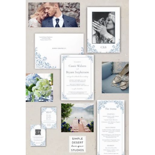 Create an invitation as timeless as your love with these Romantic Shabby Chic Blue and White Wedding that exude the perfect combination of simple elegance with a coastal chic and old money aesthetic. The versatile design is perfect for the couple that is creating a romantic theme with a classic combination of calligraphy script and typography and a slightly retro vintage graphic element. Designed by Simple Desert Designs Studio. Message us for more customised colours to match your specific hue or colour scheme.