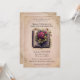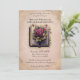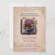 This romantic wedding invitation features a vintage fairy tale theme. An image of an old storybook is pictured in the centre, accented with red roses. The background features a faded, pink coloured parchment paper pattern. A vintage style gold frame borders the invitation.