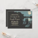 This engagement party invitation is all about nature and love. Enchanted invite for your outdoor waterfront engagement celebration. Invitation features: couple sitting on the bench near the lake surrounded by forest and old trees.