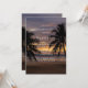 A breathtaking beach sunset scene featuring a golden and purple sky, calm ocean waves, and a black silhouette of a palm tree on the right. The warm hues reflect on the water, creating a romantic and serene atmosphere—perfect for a wedding invitation.