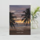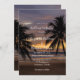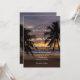 A breathtaking beach sunset scene featuring a golden and purple sky, calm ocean waves, and a black silhouette of a palm tree on the right. The warm hues reflect on the water, creating a romantic and serene atmosphere—perfect for a wedding invitation.