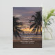 A breathtaking beach sunset scene featuring a golden and purple sky, calm ocean waves, and a black silhouette of a palm tree on the right. The warm hues reflect on the water, creating a romantic and serene atmosphere—perfect for a wedding invitation.