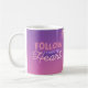A charming mug featuring an enchanting illustration of two hands reaching towards each other, connected by a delicate red line adorned with tiny hearts. Set against a dreamy pink sunset sky, this design captures the romance and whimsy of love. The inspiring phrase "Follow your heart" adds a meaningful touch, making this mug a perfect gift for lovers, couples, or anyone who cherishes the beauty of connection.
