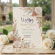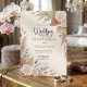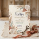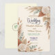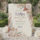 Invite your guests to an unforgettable celebration with earthy rust tones, dried palm fronds, and watercolor pampas grass for an elegant outdoor ceremony.Grounded in formal stationery design conventions, this elegant layout centers a modern calligraphy headline in warm brown and faux gold hues, supported by a highly legible, clean sans-serif secondary text. The composition is framed by an asymmetrical botanical border featuring blooming roses, dried palm fan leaves, and watercolor-style pampas grass plumes against a cream background. The color palette utilizes earthy rust, muted taupe, and soft sage green foliage, creating visual depth through simulated shadows and a subtle printed paper grain effect.This is a flat printed image with a printed paper grain and faux gold effect, not actual raised material.