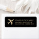 Black and gold romantic travel theme return address labels with a modern aeroplane icon with a heart in the middle in an antique faux gold colour with a mix of fonts in a creative typography design that's perfect for placing on envelopes that contain travel theme passport or boarding pass invitations and save the dates for a destination wedding.
