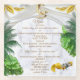 Vibrant, romantic, whimsical chic fiesta of shiny green foliage with a palm springs vibe beneath playful white silk draped through two wedding rings on a marble background with the wedding menu